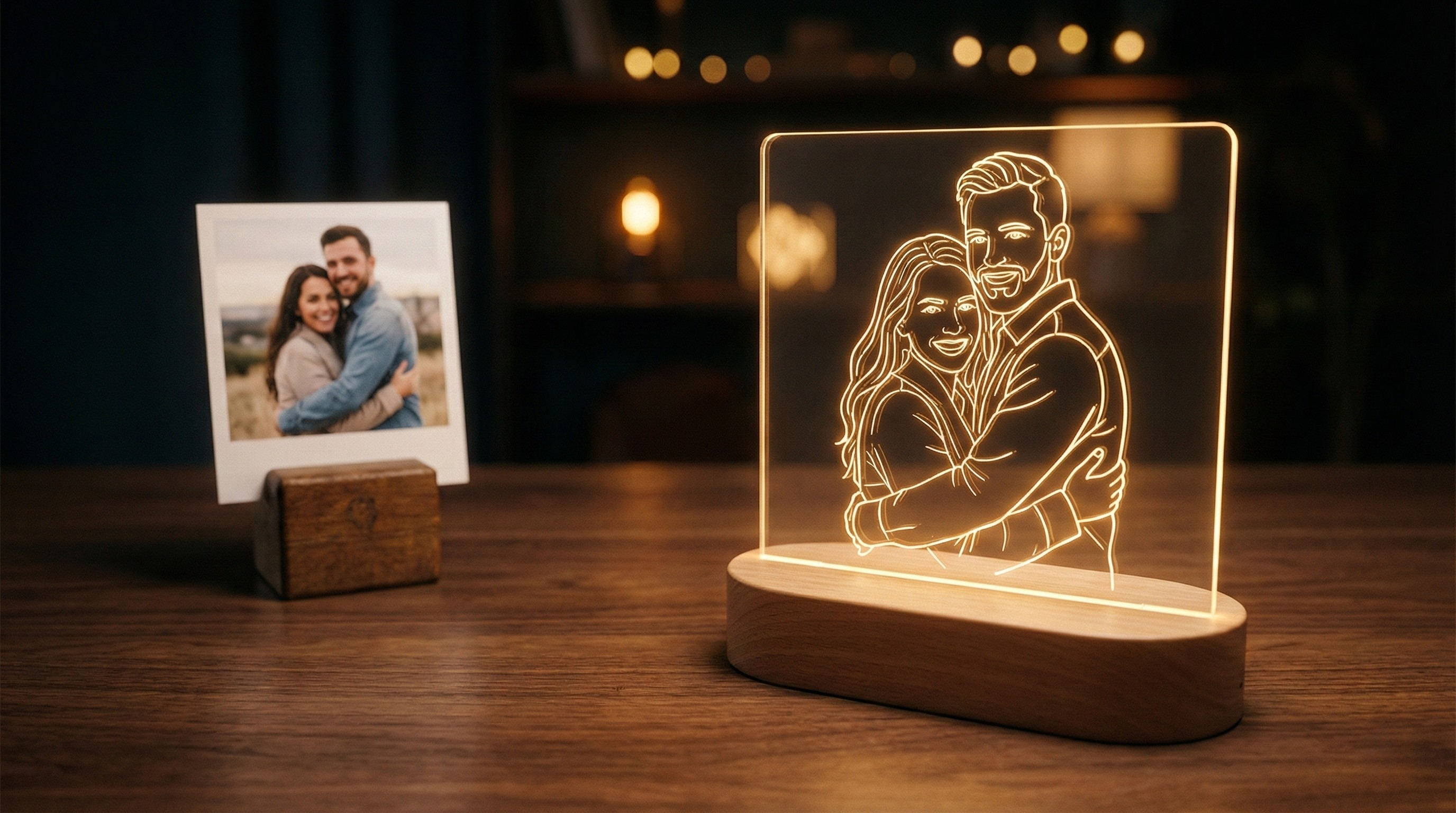 Transformez votre photo préférée en un souvenir délicatement lumineux—gravé au laser sur un acrylique cristal, posé sur un socle en bois massif.