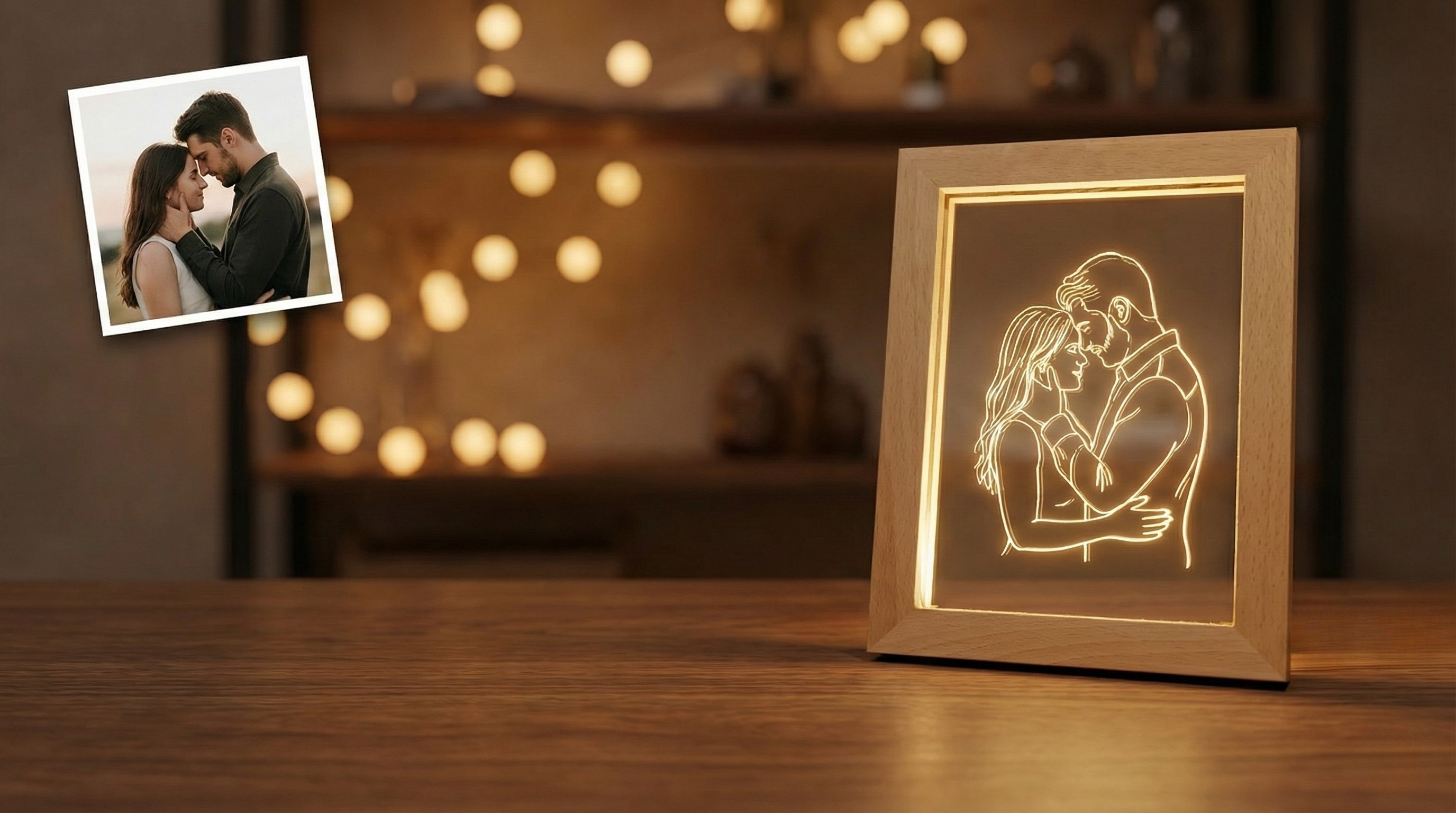 Transformez une photo favorite en un souvenir délicatement lumineux—en line art épurée, gravée au laser sur un acrylique cristal, posée sur un socle en bois massif.